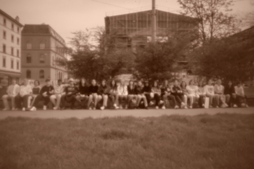 Wie man aber schnell erkennen kann, sieht es ziemlich oldschool/retro aus, obwohl ich es mit meiner Fuji-Systemkamera aufgenommen habe. Dass liegt daran, dass ich meine traditionelle Linse mit einer Pinhole-Lens, quasi einer Camera obscura, ausgewechselt habe. Zusätzlich habe ich noch den Sepia-Filter gewählt und den Schüler:innen gesagt, sie sollen nicht lachen, sondern ernst dreinblicken.