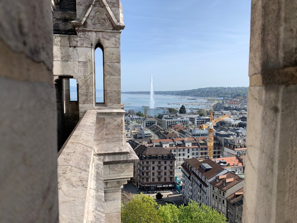 In der Kathedrale kauften wir – nur noch Ben, Sian und Aidan – uns ein Ticket, um den Turm zu besteigen. Das Ticket kostete jeden von uns 4 Franken – aus Sicht der anderen 5 Franken zu viel. Es war auch eine riesige Gruppe Kindergärtner in der Kathedrale, weshalb der Aufstieg durch die engen Wendeltreppen etwas länger dauerte. Oben angekommen genossen wir die schöne Aussicht über ganz Genf und bis in die Alpen, den Jet d’eau, den Genfersee und alle möglichen Variationen von Kranen. Wir zählten insgesamt mindestens 50! Uns beeindruckte die Architektur der Kathedrale extrem. Allerdings muss man bedenken, dass beim Bau dieses Werks womöglich durchaus der eine oder andere Arbeiter gestorben sein könnte. Wir stellten uns vor, wie die Leute im 12. Jh. es geschafft haben, solch ein riesiges Gebäude zu erbauen. Was ein Risiko diese Personen jeden Tag eingegangen sein müssen. Und wie lange so ein Bau gedauert haben muss. Die Kirche muss damals schon noch ein bisschen mehr Macht gehabt haben.
