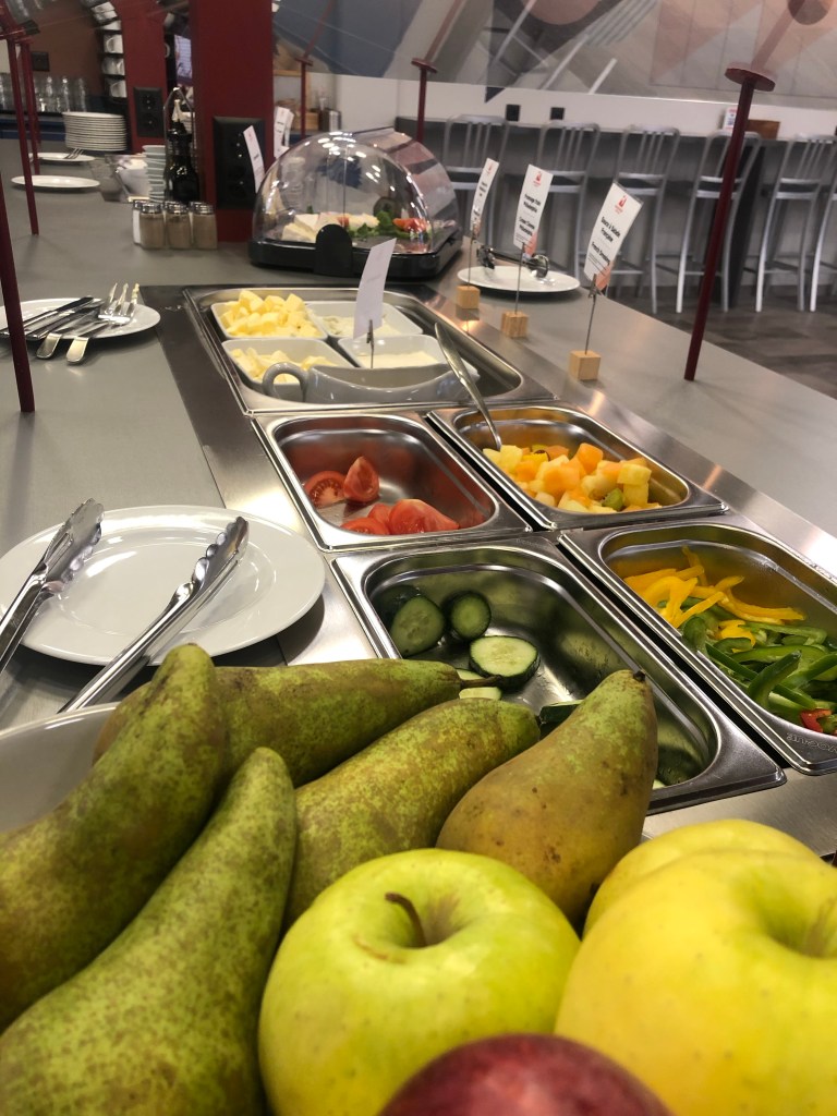 Als wir am ersten Tag uns fürs Frühstück traffen, waren wir total überwältigt. Das Buffet, welches uns erwartete, übertraf alle unsere Erwartungen. (Eigentlich sind wir auf Klassenreisen gewohnt, selbst Frühstück zu machen und dann nur Brötchen mit Konfi zu essen und Milch oder Wasser zu trinken.).