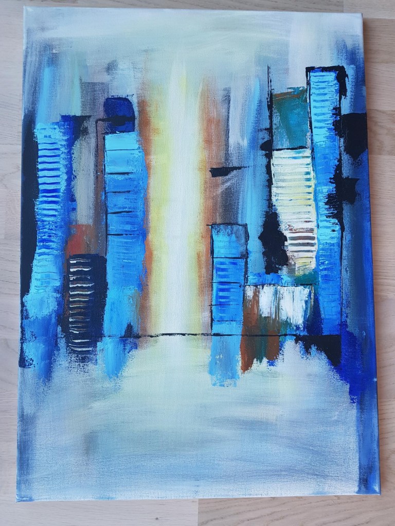 Zum einen möchte ich ein paar Bilder malen. Da wir ein zweites Haus gebaut haben und die Wände noch sehr kahl sind, möchten meine Schwester und ich diese mit ein paar Bildern schmücken. Wir haben in den Frühlingsferien schon angefangen und ich habe ein Gemälde, das ich noch fertigmachen muss. Es soll eine abstrakte Skyline hinter einem See werden und ich habe sie hauptsächlich in Blau gemalt, weil das farblich am besten in mein Zimmer oder in den Gang passt.