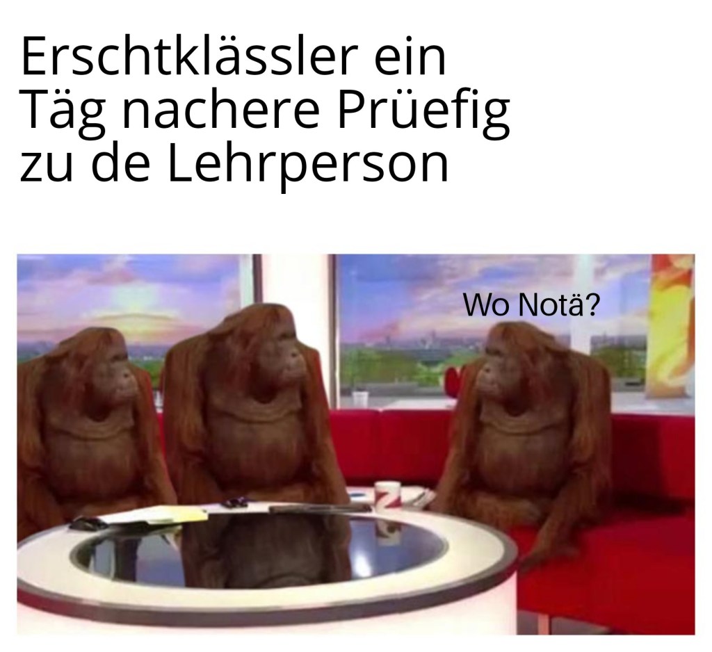Wer gerne sein(e) Meme(s) mit mir teilen und am Contest teilnehmen möchte, was v.a. bedeutet, dass ich es hier und in andern Social Media Kanälen posten werde, soll mir ihr/sein Meme über Teams oder per Mail senden (-> robin.fuerst(ät)kzu.ch) und mir auch gerade mitteilen, ob ich dabei auch seinen/ihren Namen angeben soll/darf.